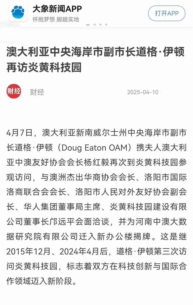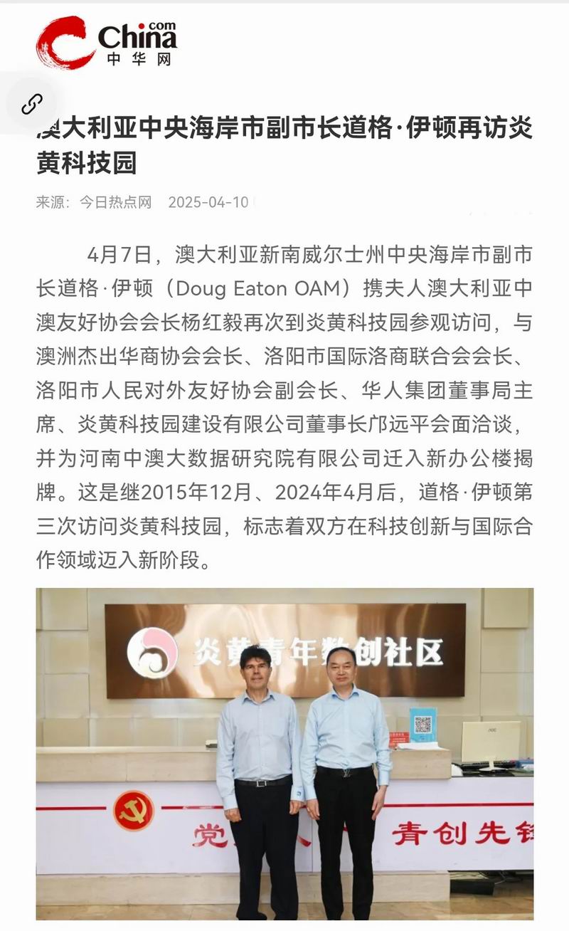 4月7日,澳大利亞新南威爾士州中央海岸市副市長道格·伊頓(Doug Eaton OAM)攜夫人澳大利亞中澳友好協會會長楊紅毅再次到炎黃科技園參觀訪問,與澳洲杰出華商協會會長、洛陽市國際洛商聯合會會長、洛陽市人民對外友好協會副會長、華人集團董事局主席、炎黃科技園建設有限公司董事長鄺遠平會面洽談,并為河南中澳大數據研究院有限公司遷入新辦公樓揭牌。這是繼2015年12月、2024年4月后,道格·伊頓第三次訪問炎黃科技園,標志著雙方在科技創新與國際合作領域邁入新階段。